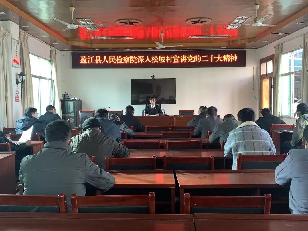 盈江县检察院党组成员、副检察长刘艳芳到盏西镇松坡村,为村两委、驻村工作队以及各片区支部书记、组长、副组长开展党的二十大精神宣讲活动,推动党的二十大精神在农村走深走实、落地生根。