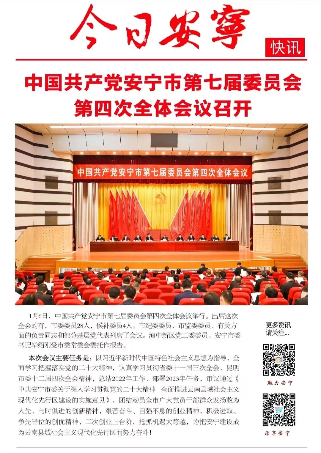中国共产党安宁市第七届委员会第四次全体会议,于2023年1月6日在安宁举行。